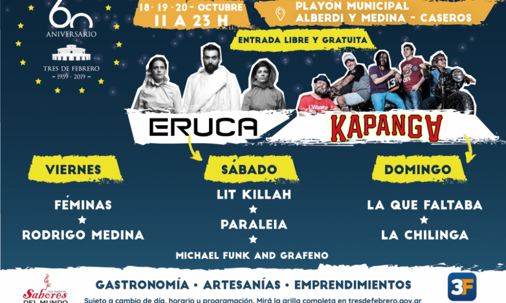 El próximo fin de semana vamos a celebrar en familia el 60° Aniversario de Tres de Febrero con una fiesta en el Playón Municipal. Del viernes 18 al domingo 20 de octubre habrá feria gastronómica, artesanos, emprendedores y bandas en vivo. El viernes llega Féminas, el sábado Lit Killah y Eruca Sativa y el domingo cerramos con La Chilinga, La que Faltaba y Kapanga.