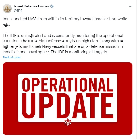 “Irán lanzó vehículos aéreos no tripulados desde su territorio hacia Israel hace poco tiempo. Las FDI están en alerta máxima y monitorean constantemente la situación operativa”, alertó el ejército de Israel en su cuenta en X.