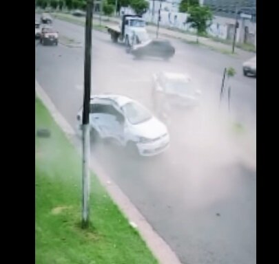 Una cámara de seguridad, a la que pudo acceder Oeste Noticias, registró el momento exacto en que un vehículo Volkswagen Suran, de color blanco, es impactado por una camioneta Ford Ranger color negro.